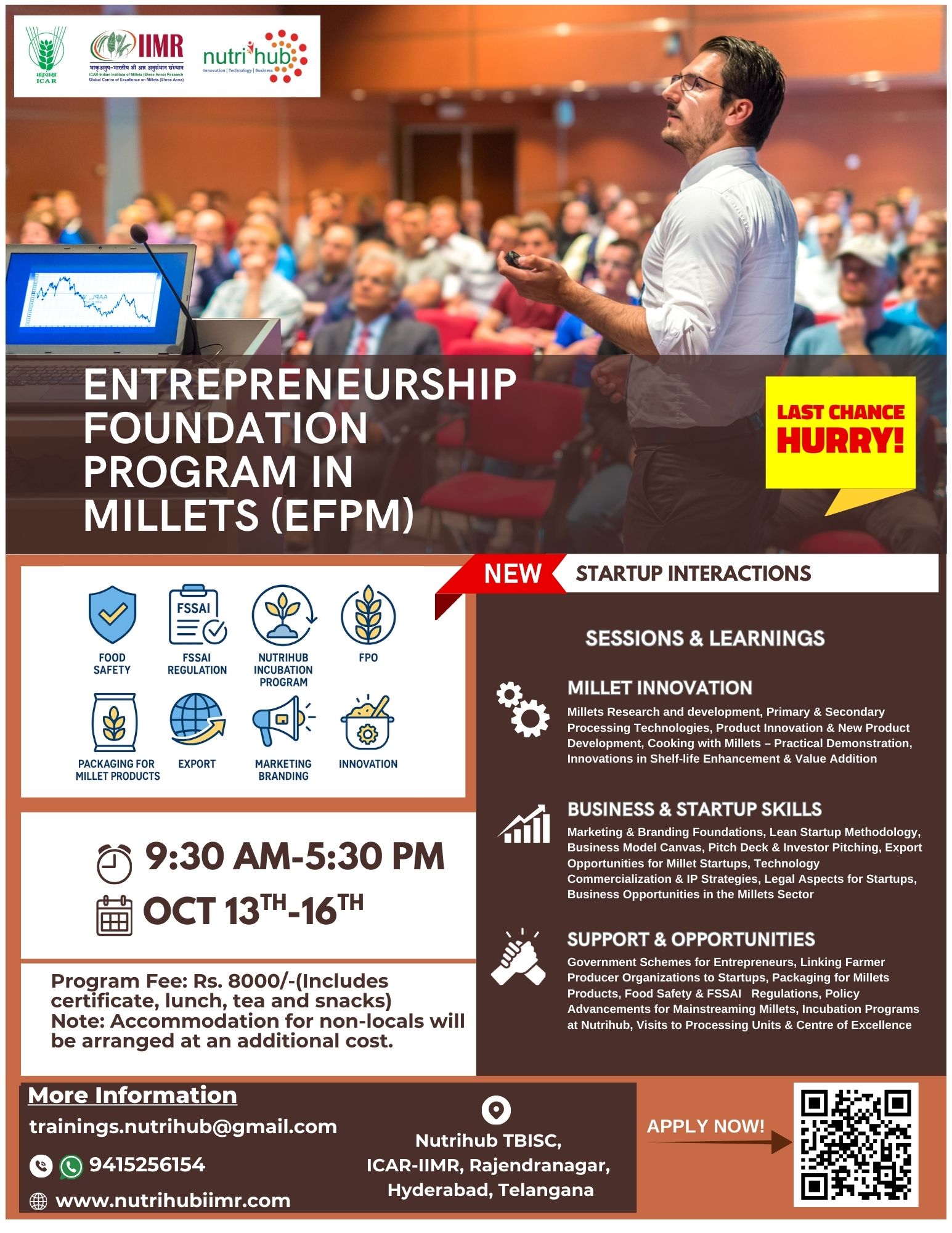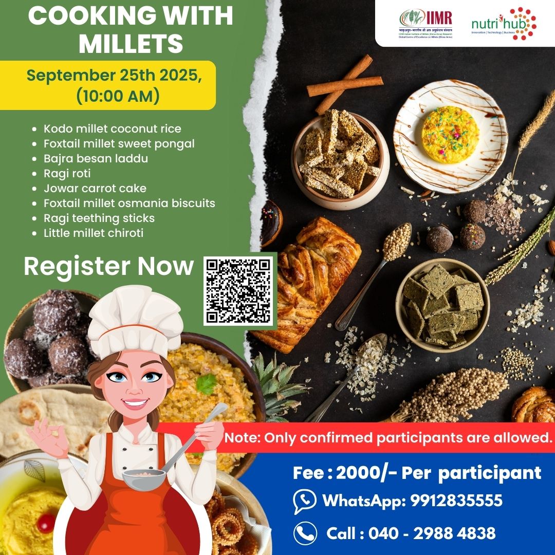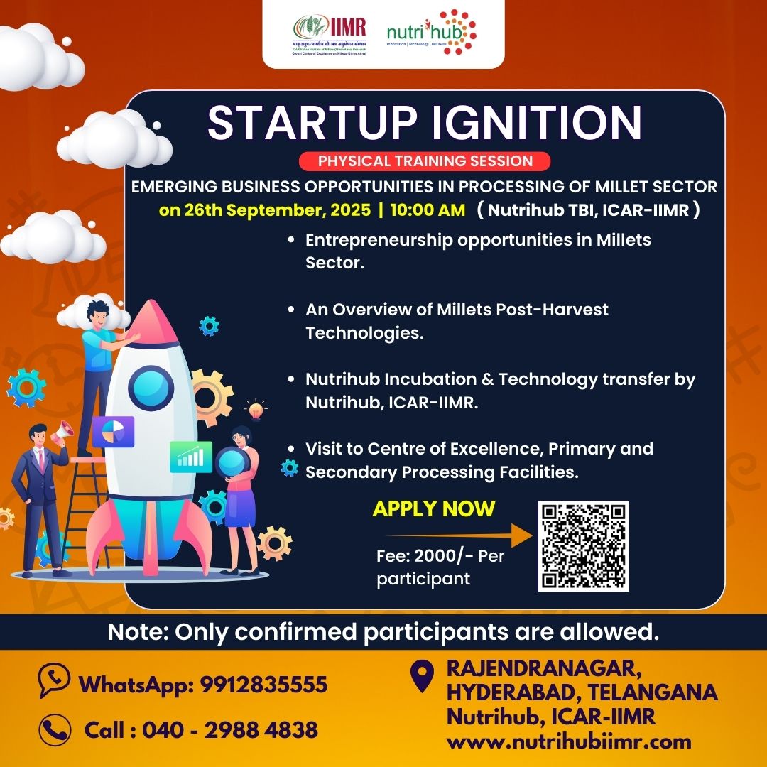 - Entrepreneurship Foundation Program In Millets (EFPM) Dates :: 13-16th October 2025 One day training programme on Cooking with Millets on 25th September 2025 One day training programme on Startup Ignition Training - Emerging Bussiness Opportunities in Processing of Millets Sector on 26th September 2025